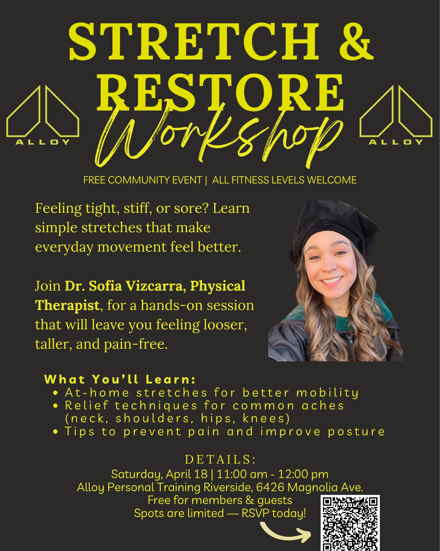Feeling tight or sore? Join our free Stretch & Restore workshop with Dr. Sofia Vizcarra. Learn simple at-home stretches, pain relief techniques, and mobility tips to help you move better and feel your best no matter your fitness level.